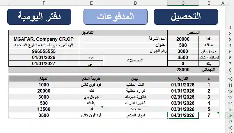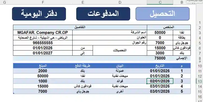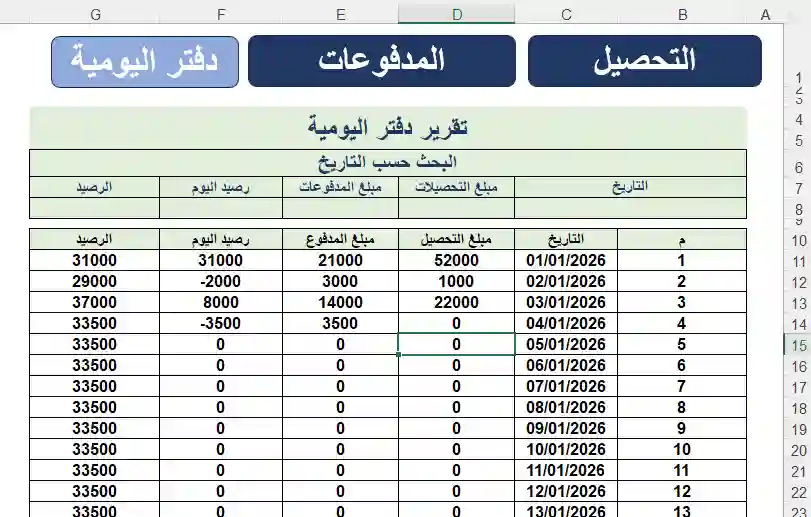 ملف احترافي لإدارة التحصيلات والمدفوعات وحساب الرصيد اليومي تلقائيًا، مناسب لأي نشاط تجاري، بدون برامج محاسبة معقدة أو اشتراكات شهرية.